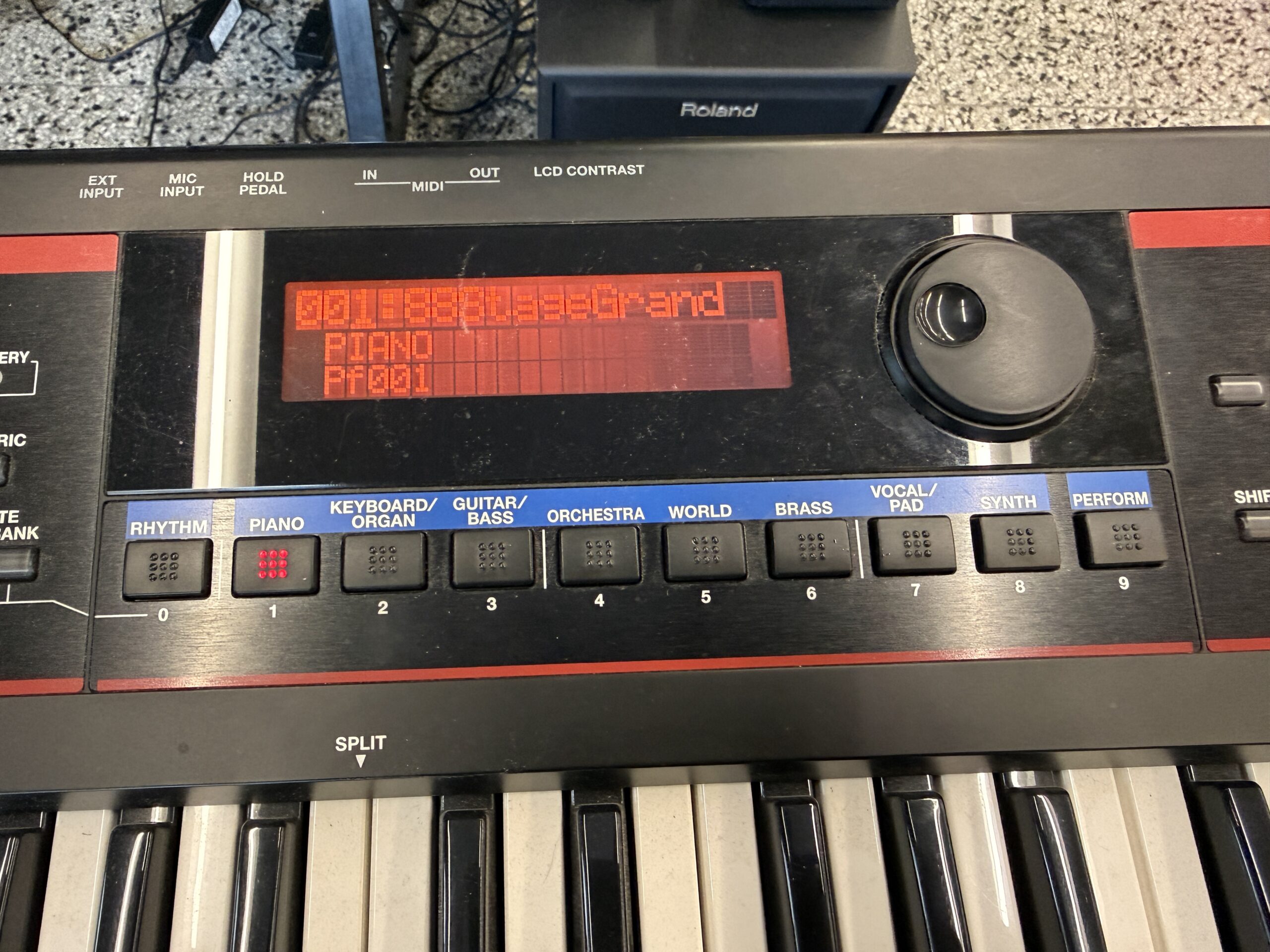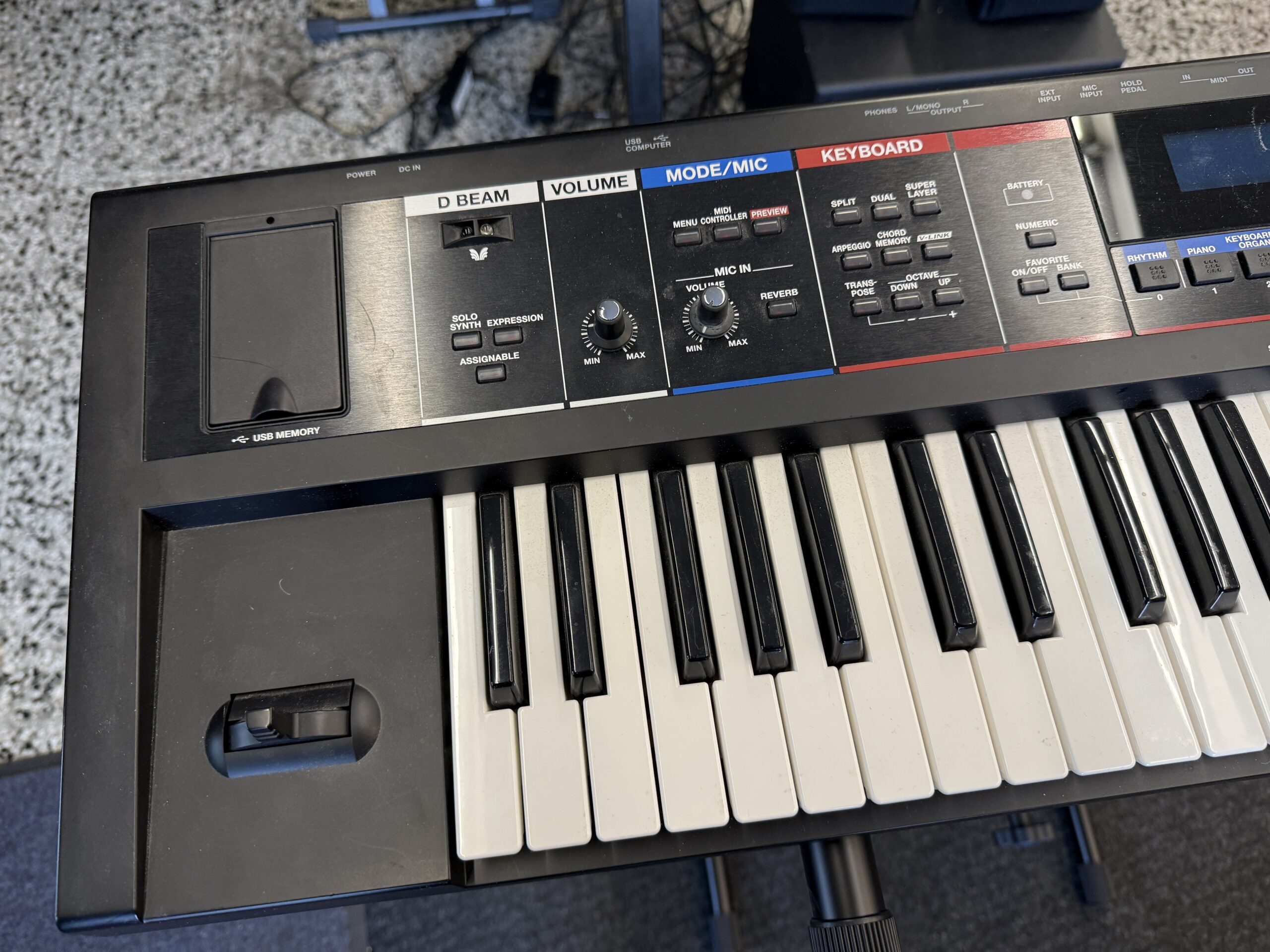 - Inputs/Outputs: Output (L/MONO, R) 1/4″, Headphone, Mic Input (1/4″), EXT Input, MIDI (IN, OUT), USB (supports memory & MIDI).