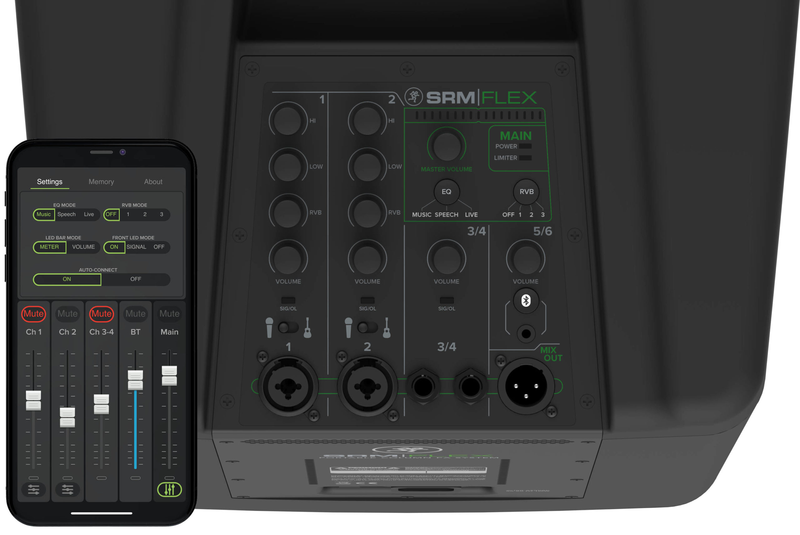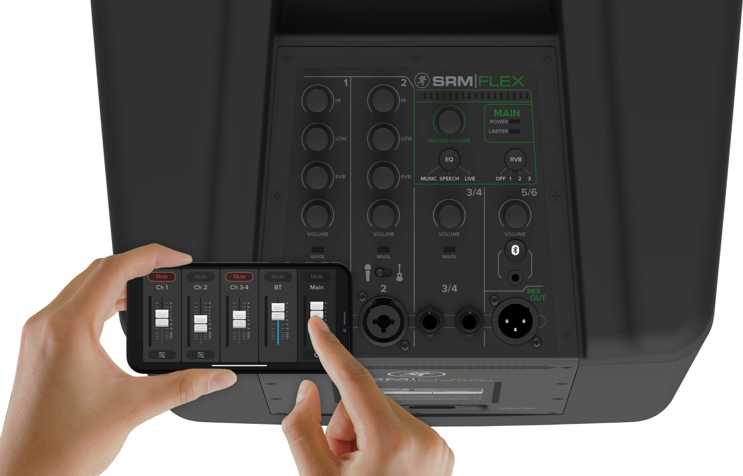 Sisäänrakennettu 6-kanavainen digitaalimikseri on niin selkeä, että haluttu soundi löytyy parhaassa tapauksessa hetkessä, ja niin tasot kuin ekvalisaattori, kaiku kuin muut toiminnot ovat ohjattavissa paitsi ihan oikeista säätönupeista, myös kätevästi mobiililaitteesta. Myös musiikki ja taustaraidat saa ohjattua Mackie SRM-Flexiin suoraan Bluetoothin kautta.
