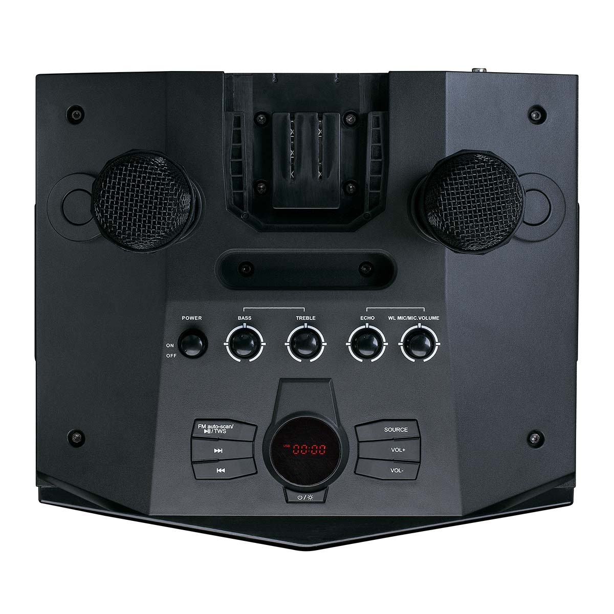 Ei juhlia ilman tätä PA-220:ta! Etupuolella olevan valaistuksen avulla voit muuttaa huoneen välittömästi todelliseksi diskoksi. Valotehosteet voidaan jopa säätää musiikin rytmin mukaan. Mukana on myös 2 langatonta mikrofonia, joten voit laulaa musiikin mukana. Etkö halua laulaa hetkeen? Säilytä mikrofonit yksinkertaisesti kaiuttimessa oleviin mikrofonipidikkeisiin.