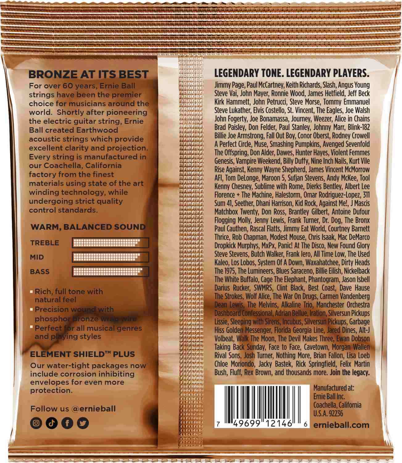 Ernie Ball Earthwood Phosphor Bronze Acoustic Guitar Strings are made from 92% copper, 7.7% tin, 0.3% phosphorus wire wrapped around tin plated hex shaped steel core wire. These guitar strings have a light orange, gold color and provide a mellow, ringing sound, with excellent clarity.