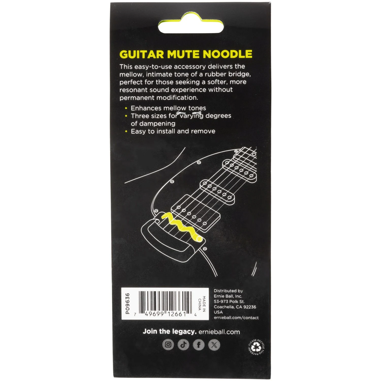 Ernie Ball Mute Noodle Guitar on helppokäyttöinen lisävaruste, joka asetetaan kielten väliin kitaran tallan kohdalle ja jäljittelee kumitallan lämmintä, intiimiä sointia. Se on täydellinen valinta soittajille, jotka haluavat resonanssiltaan rikkaamman ja pehmeämmän äänen ilman pysyviä muutoksia.