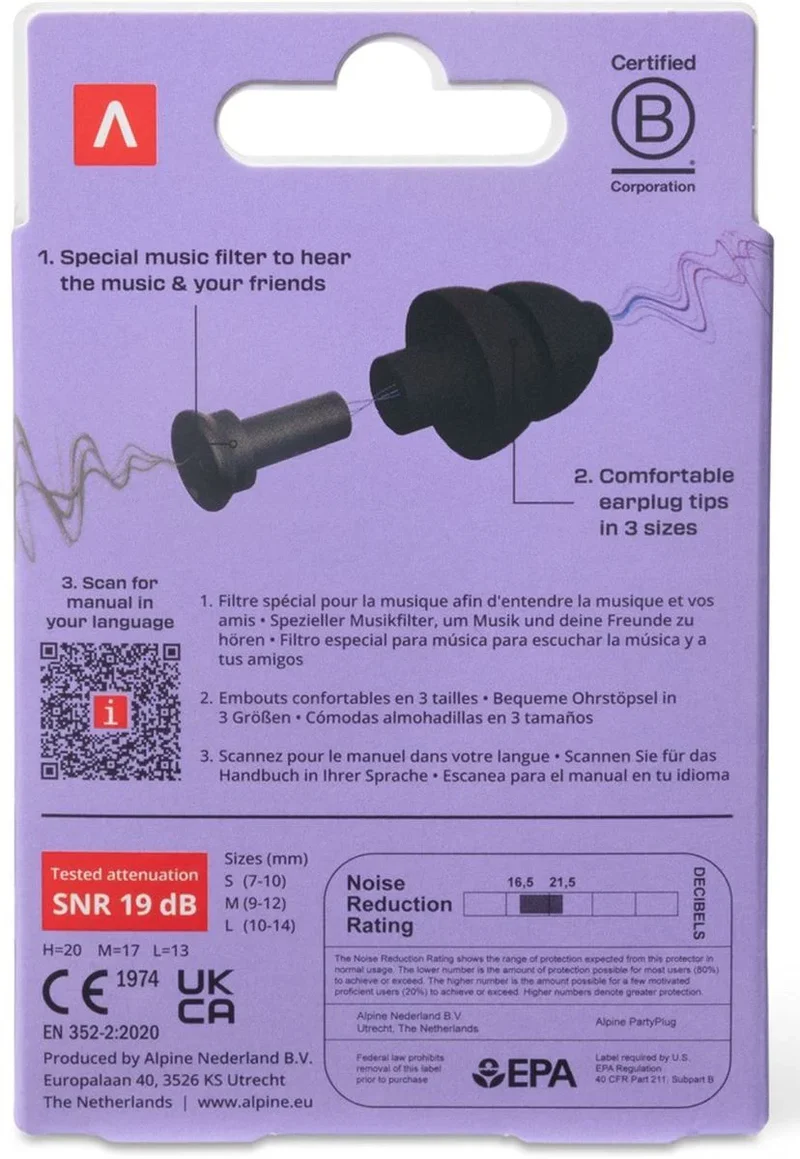 Alpine PartyPlug -korvatulpat suojaavat kuulosi keikoilla, festareilla ja muissa musiikkitapahtumissa säilyttäen äänenlaadun. Innovatiiviset AlpineAcousticFilters-suodattimet vaimentavat melua tehokkaasti, mutta päästävät musiikin ja puheen läpi selkeästi. Pehmeä AlpineThermoShape-materiaali takaa miellyttävän istuvuuden ilman silikonia. Kevyet, uudelleenkäytettävät ja helppohoitoiset tulpat toimitetaan kätevässä säilytysrasiassa. Sisältää kolme paria korvatulppia (S-, M- ja L-koko).